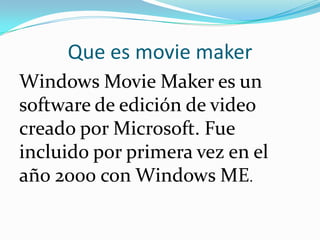 Windows Movie Maker es un software de edición de video creado por Microsoft que permite importar y editar imágenes, video y audio, agregar transiciones y efectos, y crear títulos y créditos. Ha tenido varias versiones desde su lanzamiento en 2000, siendo la más reciente Windows Live Movie Maker de 2008. Es una herramienta gratuita y de fácil uso pero con limitaciones como el formato de salida WMV y problemas para editar archivos grandes.