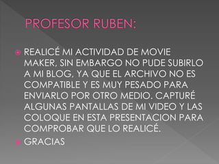 El estudiante realizó un video con Movie Maker pero no pudo subirlo a su blog debido a que el archivo no era compatible y era demasiado pesado para enviarlo por otro medio. En su lugar, incluyó capturas de pantalla de su video en la presentación para demostrar que lo había completado.