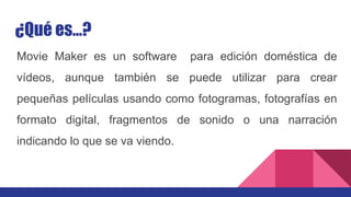Movie Maker es un software de edición de videos incluido originalmente en Windows ME en 2000. Permite combinar videos, fotos y audio para crear pequeñas películas de manera fácil. Es una herramienta útil para crear videos educativos debido a su facilidad de uso, incluso para niños. Admite una variedad de formatos de archivos de video, imagen y audio.