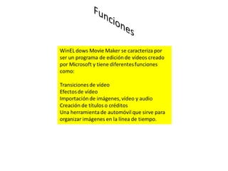 Windows Movie Maker fue introducido en 2000 como una herramienta de edición de video gratuita incluida en sistemas Windows. El programa permite importar video, audio e imágenes, aplicar transiciones y efectos, y crear títulos. Aunque es fácil de usar, tiene limitaciones como solo poder guardar los proyectos en formato WMV.