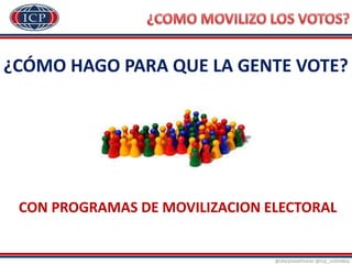 El documento detalla un programa de movilización electoral implementado por Sheyla Dallmeier para la candidatura de Henrique Capriles Radonski, centrado en un esquema 1x10 que busca organizar la base electoral y captar 3,000 votantes. Se crea una estructura de grupos operativos de trabajo (GOT) para captar electores, combinando formación y estrategias logísticas para el día de la votación. El enfoque se basa en conocer al electorado y maximizar recursos, con resultados finales superando las expectativas iniciales.