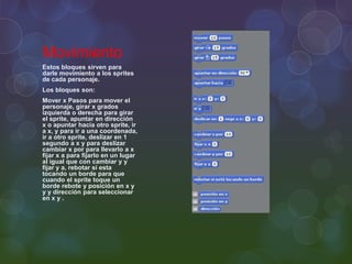 Este documento describe los diferentes bloques de programación disponibles en Scratch para controlar el movimiento, apariencia, sonido, herramientas de dibujo y sensores de los sprites, así como variables y bloques de control para dirigir el flujo del programa. Se explican bloques para mover sprites, cambiar su disfraz, tamaño y efectos visuales, reproducir sonidos, dibujar con el lápiz, detectar interacciones y establecer condiciones para la ejecución de acciones.