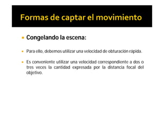 El documento proporciona instrucciones sobre cómo capturar el movimiento en la fotografía. Explica que para congelar un objeto en movimiento se necesita una velocidad de obturación alta, mientras que para desenfocar el fondo se requiere una velocidad baja. También cubre técnicas como el barrido y cómo afecta la abertura del diafragma a la profundidad de campo.