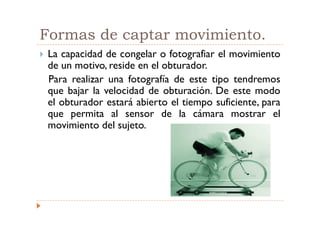 Este documento describe diferentes técnicas para capturar el movimiento en fotografía, incluyendo congelar el movimiento, capturar el movimiento y barrido. Explica los tipos de obturador y cómo variar la velocidad de obturación afecta la nitidez. También resume los pasos para revelar película y papel fotográfico, incluyendo los químicos y tiempos requeridos.