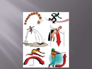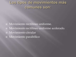 Este documento describe los principales tipos de movimiento: movimiento rectilíneo uniforme, movimiento rectilíneo uniformemente acelerado, movimiento circular y movimiento parabólico. Explica que el movimiento rectilíneo uniforme tiene velocidad constante, mientras que el movimiento rectilíneo uniformemente acelerado tiene aceleración constante. El movimiento circular tiene radio y velocidad angular constante, mientras que la velocidad cambia de dirección. Finalmente, el movimiento parabólico sigue una trayectoria parabólica