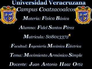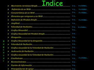 El documento aborda el movimiento armónico simple, definiéndolo como un movimiento periódico donde la posición varía según funciones trigonométricas. Se discuten sus elementos, características y ecuaciones relacionadas con la elongación, velocidad y aceleración. Además, se presenta el péndulo simple como un ejemplo práctico de este tipo de movimiento.