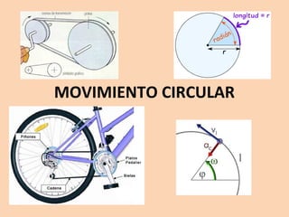 El documento describe las magnitudes fundamentales del movimiento circular como el periodo, la frecuencia y el radián. Explica que el periodo es el tiempo que tarda un cuerpo en dar una vuelta completa, mientras que la frecuencia es el número de vueltas por unidad de tiempo. También define el movimiento circular uniforme como aquel en que un objeto se mueve a velocidad constante en una trayectoria circular.