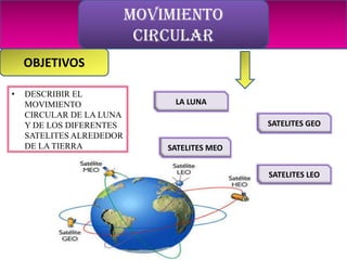 El documento describe los diferentes tipos de órbitas satelitales alrededor de la Tierra. Incluye satélites geoestacionarios (GEO) a 36,000 km de altura y un período de rotación de 24 horas, satélites de órbita terrestre media (MEO) como los satélites GPS a 20,150 km de altura y un período de rotación de 14 horas, y satélites de órbita terrestre baja (LEO) como los satélites Iridium a 1,450 km de altura y un período de rotación de