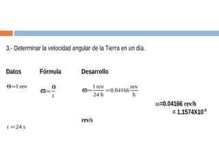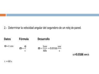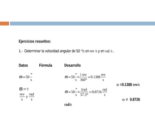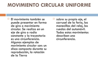 Este documento describe el movimiento circular uniforme, donde un objeto se mueve a lo largo de una circunferencia a una velocidad constante. Explica que la trayectoria es una circunferencia y el desplazamiento se mide en términos del ángulo recorrido. También define el movimiento circular uniforme como aquel donde un objeto mantiene la magnitud de su velocidad al cambiar continuamente su dirección a lo largo de una trayectoria circular.