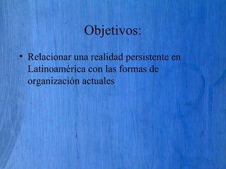 El documento describe el movimiento indigenista en Latinoamérica, el cual comenzó como movimientos locales independientes pero ahora se ha unificado para defender los derechos de los pueblos indígenas. La Coordinadora Andina de Organizaciones Indígenas (CAOI) representa formalmente este movimiento y busca estados plurinacionales que reconozcan constitucionalmente la diversidad de naciones y culturas indígenas.