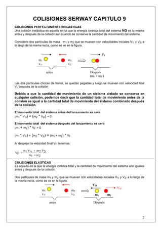 Este documento presenta información sobre colisiones elásticas e inelásticas en una dimensión. Explica que en una colisión inelástica la energía cinética total no se conserva, mientras que en una colisión elástica sí se conservan tanto la energía cinética como la cantidad de movimiento. Resuelve ejemplos numéricos aplicando estas ideas, como determinar la velocidad de retroceso de una máquina lanzadora de pelotas o la velocidad final de dos autos enganchados después de una colisión.