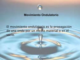 Este documento describe las características fundamentales del movimiento ondulatorio. Explica que una onda es una perturbación que se propaga a través de un medio y transporta energía sin transportar materia. Define términos clave como periodo, frecuencia, longitud de onda y velocidad. Además, clasifica las ondas según el medio, la dirección de vibración y si son viajeras o estacionarias. Finalmente, da ejemplos de ondas mecánicas y electromagnéticas.