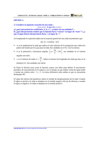 El documento presenta la ecuación de una onda plana transversal que se propaga en la dirección positiva del eje x. La ecuación proporciona valores para la frecuencia, período, longitud de onda y número de onda de la onda, los cuales son utilizados para calcular la velocidad de propagación. Adicionalmente, se analiza el movimiento ondulatorio representado y se clasifica la onda como transversal debido a su forma de propagación.