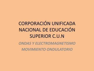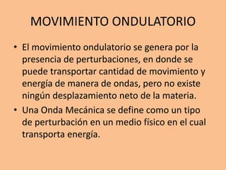 Este documento describe las propiedades y características del movimiento ondulatorio. Explica que existen ondas mecánicas, que requieren de un medio para propagarse, y ondas electromagnéticas que no necesitan medio. Describe los elementos clave de una onda como longitud de onda, frecuencia, amplitud y velocidad. También cubre conceptos como ondas longitudinales, transversales, difracción, refracción e interferencia.