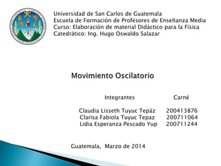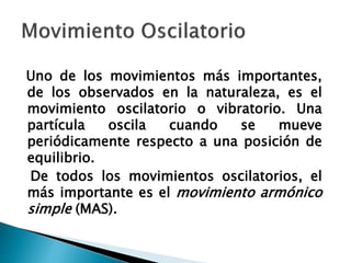 Este documento describe el movimiento armónico simple y el péndulo simple. Explica que el movimiento armónico simple es un movimiento periódico y oscilatorio descrito por una función senoidal. También define términos como amplitud, periodo y frecuencia. Luego describe el péndulo simple como una partícula suspendida de una cuerda que oscila alrededor de su posición de equilibrio, realizando un movimiento armónico simple. Finalmente, menciona que el péndulo se usa comúnmente para medir tiempos y la aceleración