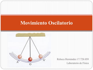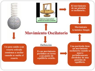 Este documento define el movimiento oscilatorio y el movimiento armónico simple. Explica que el movimiento oscilatorio es periódico alrededor de un punto de equilibrio y que el movimiento armónico simple ocurre bajo la acción de una fuerza elástica sin rozamiento. También describe elementos como la amplitud, el período y la frecuencia. Se usa el péndulo simple como ejemplo de movimiento armónico y se presentan fórmulas para calcular su período. Finalmente, se discuten aplicaciones del movimiento armónico simple en ingenier