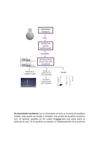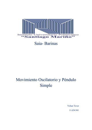 El documento describe el movimiento oscilatorio y el péndulo simple. Explica que el movimiento oscilatorio es un movimiento alrededor de un punto de equilibrio estable, y que un péndulo simple consiste en una masa suspendida de un hilo inextensible que oscila bajo la influencia de la gravedad. También detalla algunas aplicaciones del péndulo simple en la ingeniería civil como en puentes y edificios para contrarrestar fuerzas.