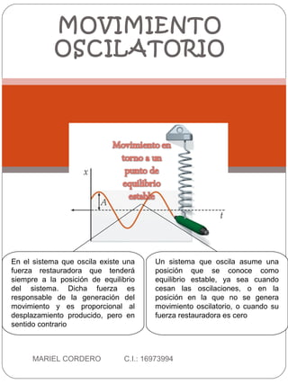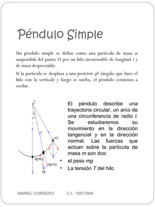 Este documento describe el movimiento oscilatorio y el péndulo simple. Explica que en un sistema oscilatorio existe una fuerza restauradora que intenta devolver el sistema a su posición de equilibrio estable. Luego define el péndulo simple como una partícula suspendida de un hilo inextensible y describe su movimiento oscilatorio circular. Finalmente, discute aplicaciones del movimiento oscilatorio y péndulos en la ingeniería civil, incluyendo su uso para contrarrestar terremotos en edificios y puentes.
