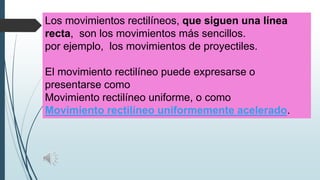 El documento describe el movimiento rectilíneo uniforme, definido por Galileo como un movimiento a velocidad constante en una sola dirección. Explica que la velocidad se calcula como la distancia recorrida dividida por el tiempo, y presenta fórmulas y ejemplos numéricos para calcular distancia, velocidad y tiempo en este tipo de movimiento.