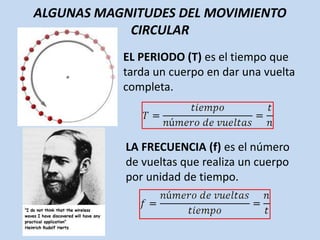El documento describe las magnitudes del movimiento circular, como el periodo y la frecuencia, así como las relaciones entre ellas. Se explica el movimiento circular uniforme, donde un objeto se mueve con rapidez constante, y se introduce el concepto de velocidad angular y aceleración angular. Se mencionan los principios fundamentales que rigen estos movimientos.