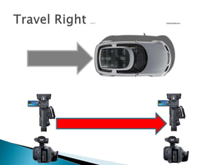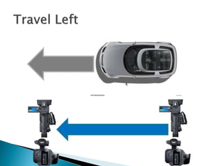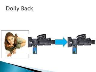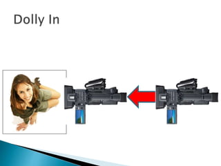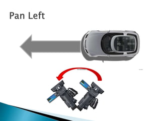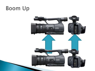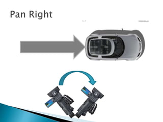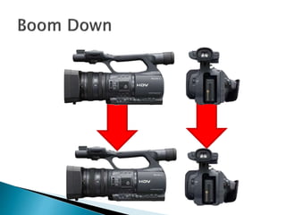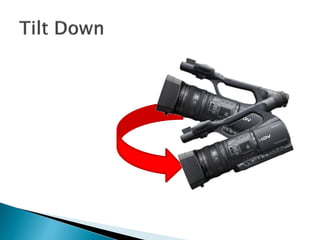 El documento describe los diferentes movimientos de cámara en la cinematografía, incluyendo giros horizontales y verticales. Se mencionan términos específicos como panning, tilt y dolly, así como movimientos de seguimiento. Estos movimientos son esenciales para la narrativa visual en la producción de video y cine.