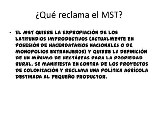 El Movimiento de los Trabajadores sin Tierra (MST) del Brasil reclama la expropiación de los grandes latifundios improductivos y la definición de un límite máximo de hectáreas para la propiedad rural. Surge en el contexto de movimientos campesinos anteriores que fueron destruidos por la dictadura militar en los años 1960 y 1970. El modelo agrario histórico de Brasil ha sido la gran propiedad de tierras por pocos dueños, lo que motiva la lucha del MST.