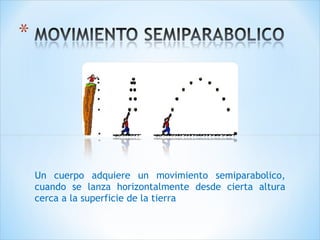 El documento describe el movimiento semiparabólico de objetos lanzados horizontalmente desde una cierta altura. Explica que este movimiento combina una trayectoria rectilínea horizontal y otra caída libre vertical acelerada debido a la gravedad. Presenta ecuaciones para calcular variables como el tiempo en el aire, el alcance horizontal y la velocidad al llegar al suelo. Además, resuelve ejemplos numéricos aplicando estas fórmulas.