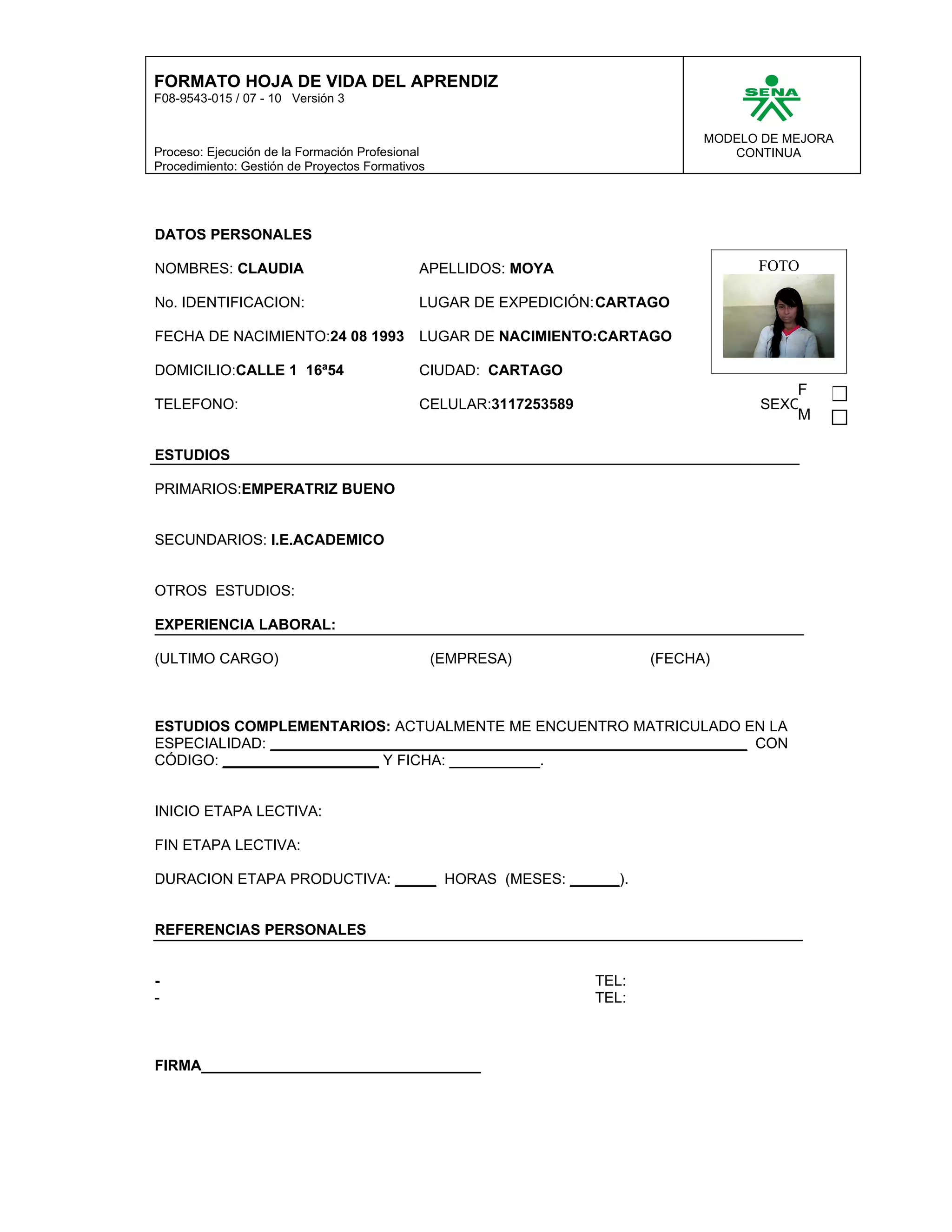 Este documento presenta un modelo de hoja de vida para un aprendiz que incluye secciones para datos personales, estudios, experiencia laboral, estudios complementarios actuales, fechas de inicio y fin de la etapa lectiva, duración de la etapa productiva, y referencias personales. La hoja de vida recopila información relevante sobre la educación, antecedentes y detalles de contacto de un aprendiz para fines de capacitación y colocación laboral.