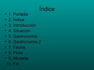 Mozambique se encuentra en el sureste de África y limita con Tanzania, el Océano Índico, Sudáfrica, Suazilandia, Zimbabue, Zambia y Malawi. La gastronomía de Mozambique tiene influencia portuguesa y destaca platos con pescado, pollo, verduras tropicales, maíz, cacahuetes y frutas como banana y piña. La fauna incluye leones, elefantes, leopardos, cocodrilos, búfalos y aves, y la flora conti