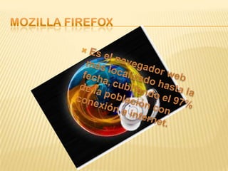 Este documento proporciona información sobre el navegador web Mozilla Firefox. Firefox es un navegador gratuito y de código abierto desarrollado para Windows, Mac y Linux. Actualmente tiene aproximadamente un 23% de cuota de mercado a nivel mundial. El documento destaca las características de alto rendimiento, personalización y accesibilidad universal de Firefox.