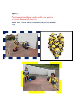 Este documento presenta 12 pruebas o retos para un grupo. Los retos incluyen transportar pelotas de una rueda a otra, mantener una pelota en el aire sin que toque el suelo, inventar una historia usando dibujos, meter bolas en un tragabolas uno por uno, recorrer un circuito sin tocar el suelo, completar rompecabezas usando piezas de sobres, recordar objetos después de un minuto, hacer reír a un líder sin hacer cosquillas, bailar con música diferente durante un minuto, construir