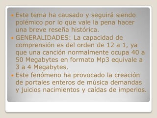 El documento habla sobre el formato de audio digital Mp3, el cual usa un algoritmo de compresión con pérdida para reducir el tamaño de archivo de la música manteniendo la calidad de sonido. Explica que Mp3 reduce el tamaño de una canción a entre 3 y 4 megabytes desde los 40-50 megabytes originales y menciona algunos sitios web populares para escuchar música en este formato como Fulltono.com y Enladisco.com.