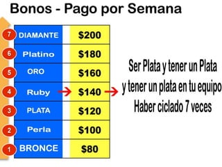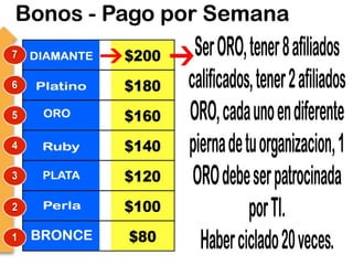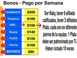 El documento promueve un negocio de venta de comestibles por internet llamado My Premier Business. Ofrece varios pasos para unirse al negocio con una inversión inicial de $210 dólares y ganar dinero invitando a otras personas. Explica cómo ganar $50 dólares por cada nueva persona reclutada y $300 dólares completando un "ciclo" con 6 personas. También describe bonos adicionales por el reclutamiento y progreso de otros participantes en la organización.