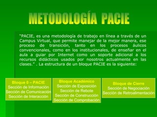 El documento describe la metodología PACIE para el aprendizaje en línea. PACIE se basa en la presencia, el alcance, la capacitación, la interacción y el aprendizaje electrónico. Un bloque académico PACIE contiene secciones de exposición, rebote, construcción y comprobación para presentar información, fomentar la discusión y construir el conocimiento. El objetivo es guiar la transición al aprendizaje en línea y crear un ambiente que facilite la interacción virtual.