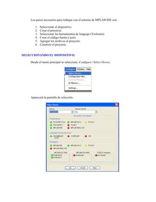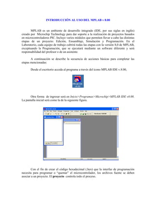 Este documento introduce el uso del entorno de desarrollo integrado MPLAB v8.00 para proyectos basados en microcontroladores PIC. Explica los pasos básicos para editar, ensamblar, simular y generar el código hexadecimal necesario para programar el microcontrolador, incluyendo la selección del dispositivo, la creación de un proyecto, la adición de archivos fuente y la construcción del proyecto.