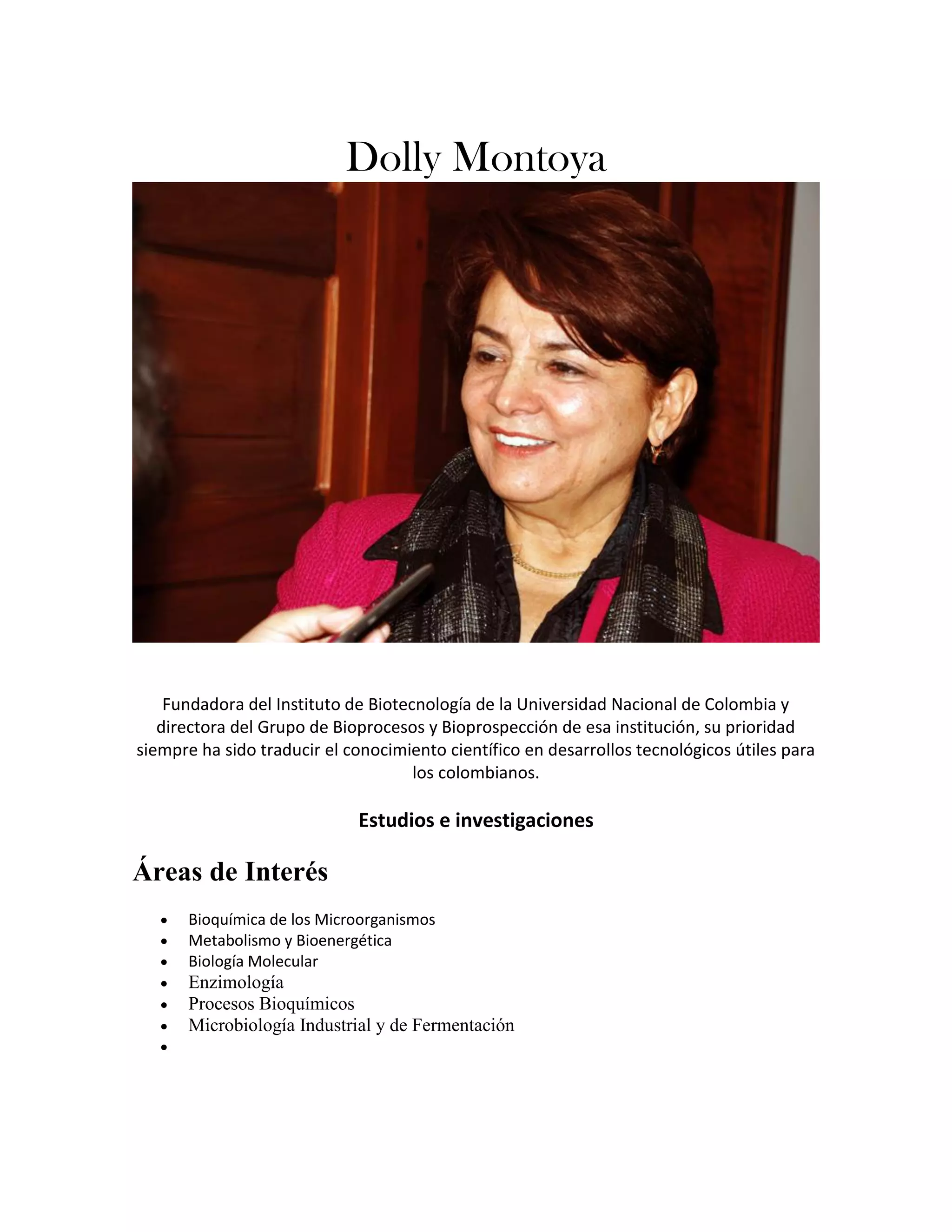 Dolly Montoya es la fundadora del Instituto de Biotecnología de la Universidad Nacional de Colombia y directora del Grupo de Bioprocesos y Bioprospección. Sus áreas de interés incluyen bioquímica de microorganismos, metabolismo, biología molecular, enzimología y procesos bioquímicos. Ha publicado numerosos artículos y ha recibido varios reconocimientos y premios por su trabajo en biotecnología, especialmente en el desarrollo de procesos y productos biotecnológicos útiles