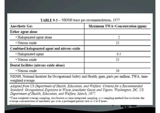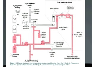 La máquina de anestesia está formada por varios componentes como el aparato de anestesia, vaporizadores, circuito respiratorio, ventilador y sistema de eliminación de gases. El circuito se divide en de alta, intermedia y baja presión. Incluye balones de oxígeno, reguladores de presión, flujómetros y vaporizadores para administrar los anestésicos. El sistema circular incluye válvulas unidireccionales y bolsa reservorio para absorber el dióxido de carbono con cal sodada.