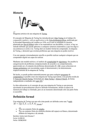 1) La máquina de Turing es un modelo computacional abstracto que realiza cálculos leyendo y escribiendo símbolos sobre una cinta infinita. 2) Está compuesta por un alfabeto de entrada y salida, estados finitos, y reglas de transición que especifican cómo la máquina cambia de estado y se mueve sobre la cinta. 3) La máquina de Turing puede simular cualquier algoritmo y es equivalente en poder computacional a los computadores reales.