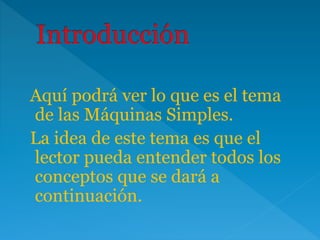 El documento presenta información sobre las máquinas simples. Define una máquina simple como un dispositivo en el que la energía de entrada y salida se encuentra en forma de trabajo mecánico y todas sus partes son sólidas. Explica que las máquinas simples permiten aplicar una fuerza en un lugar para realizar trabajo en otro, o usar una pequeña fuerza para producir una fuerza mayor. Luego describe seis tipos básicos de máquinas simples: palancas, poleas, ruedas y ejes, planos inclinados, tornillos y cuñas