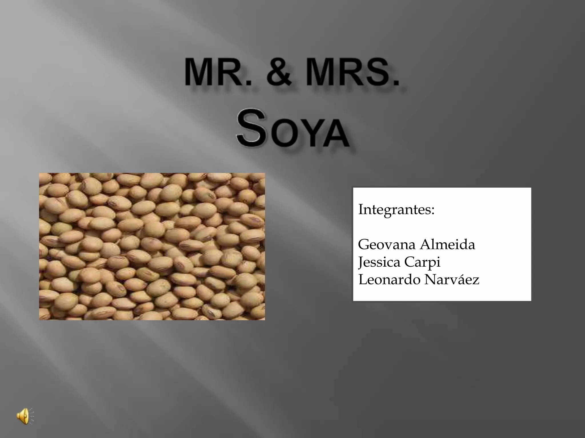 El documento presenta una empresa llamada Mr. & Mrs. Soya, cuyo objetivo es concientizar a la población sobre los beneficios nutricionales y vitaminas de la soya a través de sus productos. La empresa busca ser líder en la comercialización de la soya y sus derivados en los próximos tres años para aumentar su clientela y ganancias. Entre los beneficios de la soya se destacan la reducción de síntomas de menopausia, ayuda para controlar la diabetes y el colesterol, y prevención de enfermedades