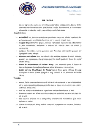 Este documento compara cuatro herramientas para gestionar marcadores web: Mr Wong, Delicious, Diigo y Edmodo. Mr Wong permite guardar sitios favoritos de forma pública o privada y crear grupos. Delicious permite guardar páginas favoritas con descripciones y etiquetas de forma gratuita y accesible desde cualquier ordenador. Diigo permite guardar enlaces online mediante etiquetas y crear cuentas de estudiantes fácilmente. Edmodo es una plataforma gratuita que permite la comunicación entre profesores, estudiant