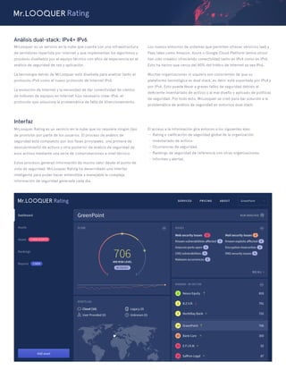 Mrlooquer Rating es un servicio de protección y análisis continuo de la seguridad de activos expuestos a Internet, diseñado para mitigar riesgos y proporcionar alertas tempranas sobre vulnerabilidades. Utiliza tecnología dual-stack que analiza tanto IPv4 como IPv6, facilitando la identificación y monitoreo de riesgos en la infraestructura organizativa. Además, ayuda a las organizaciones a cumplir con normativas como el GDPR, haciendo accesible la información de seguridad a través de una interfaz inteligente.