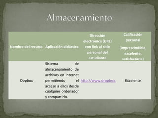 El documento presenta una lista de recursos digitales, incluyendo Dropbox, Goear, Blogger, Google, Hangout, Myheritage, Preceden y Slideshare. Cada recurso describe brevemente su aplicación didáctica y se clasifica como imprescindible, excelente o satisfactoria.
