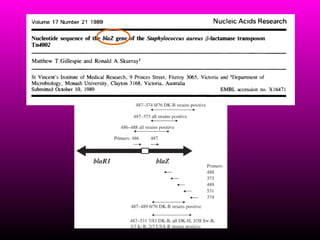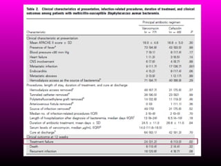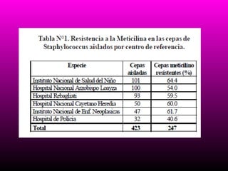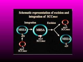 Este documento resume la evolución de la resistencia a los antimicrobianos en Staphylococcus aureus, incluyendo la aparición de resistencia a la meticilina en los 1970s y resistencia a la vancomicina en los 1990s. También describe las diferencias entre MRSA asociado al hospital versus MRSA asociado a la comunidad, incluyendo factores de riesgo, tipos genéticos y manifestaciones clínicas. Finalmente, discute mecanismos de resistencia y opciones terapéuticas para MRSA.