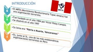 Este documento describe la toma de la residencia del embajador de Japón en Perú por parte del grupo terrorista MRTA en 1996. Los militantes del MRTA tomaron la residencia durante una celebración, tomando más de 800 rehenes. Tras 125 días de negociaciones fallidas y planes militares secretos, las fuerzas armadas peruanas lanzaron la Operación Chavín de Huantar, excavando un túnel para ingresar sorpresivamente a la residencia y liberar a los 72 rehenes restantes, poniendo fin al secuestro sin más bajas civiles.