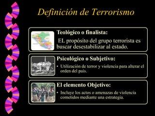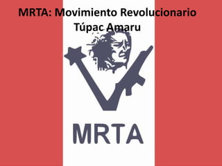 El documento resume la historia y las acciones del grupo terrorista peruano MRTA (Movimiento Revolucionario Túpac Amaru). Se formó en 1982 a partir de la fusión de otros grupos de izquierda como el PSR Leninista y el MIR. Su objetivo era desestabilizar al Estado peruano mediante actos de violencia como asesinatos, secuestros y ataques con coches bomba, causando más de 1,000 víctimas entre 1980-2000. El MRTA llegó a tener más de 2,000 miembros armados en los años 90, pero sufrió