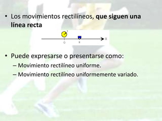 El documento describe el movimiento rectilíneo uniforme (MRU), definido por Galileo como aquel en el que los espacios recorridos por un móvil en tiempos iguales son iguales. Se caracteriza por una velocidad constante en magnitud, sentido y dirección. En un MRU no hay aceleración y la gráfica de distancia frente a tiempo es una línea recta. El documento incluye ejemplos de cálculos de distancia y tiempo para objetos que se mueven con MRU.