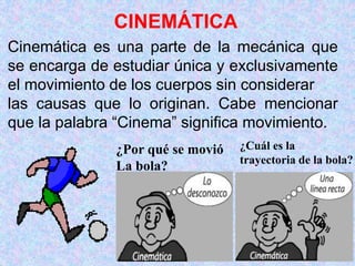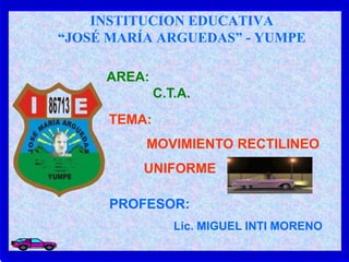 El documento trata sobre el movimiento rectilíneo uniforme. Explica conceptos como sistema de referencia, móvil, trayectoria, desplazamiento, espacio recorrido, velocidad, aceleración y provee la fórmula para calcular distancia, tiempo y velocidad en el movimiento rectilíneo uniforme. También presenta ejemplos de problemas y su resolución.