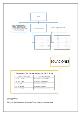 Este documento presenta información sobre el movimiento rectilíneo uniformemente acelerado (MRUA). Explica que en el MRUA, la partícula se mueve en línea recta con una aceleración constante, por lo que su velocidad aumenta linealmente con el tiempo y su posición varía cuadráticamente con el tiempo. También incluye ecuaciones que describen la relación entre la aceleración, velocidad y posición con respecto al tiempo para este tipo de movimiento.