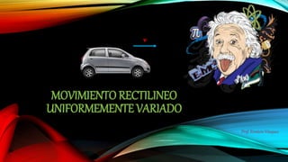El documento describe el movimiento rectilíneo uniformemente variado (MRUV), donde un objeto se mueve a lo largo de una trayectoria recta con cambios iguales de velocidad en intervalos de tiempo iguales. Los objetivos de la clase son que los estudiantes reconozcan las características de un MRUV y apliquen sus propiedades a problemas de la vida diaria. La aceleración en un MRUV es constante y la velocidad cambia linealmente con el tiempo.
